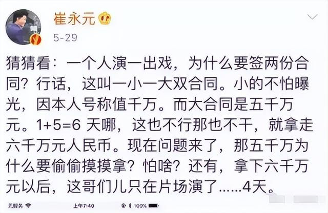 当时,崔永元通过微博晒出多份拍戏合同,其中疑似涉及范冰冰与制片方签订“大小合同”逃税。