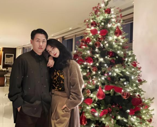 没有了往日在镜头前的浓妆艳抹,素颜的她脸上洋溢着甜美的笑容,像个少女般依偎在一个年轻男子肩头。